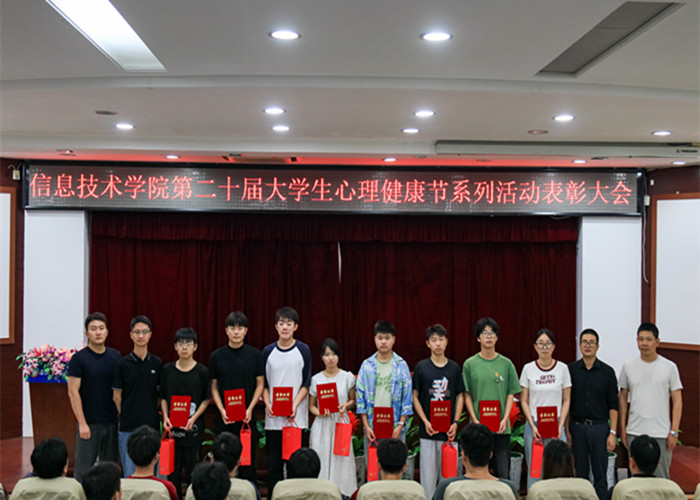 6月11日下午,信息技术学院在图书馆报告厅隆重举行第二十届心理健康节系列活动表彰大会,学院党总支副书记杜洪宇、团总支负责人孙颖凯、辅导员赵德志、彭思远和获奖学生代表参加会议,随着活动先进个人的评出,本届心理健康节系列活动圆满结束。
