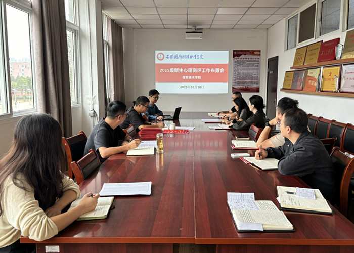 本网讯(信息技术学院 彭思远)为扎实推进学院心理健康教育工作,精准掌握学生心理动态,筑牢学生心理健康安全防线,10月10日下午,信息技术学院在知行楼304会议室召开新生心理测评工作布置会暨学生心理健康状况研判会。学院党总支书记王胜、副书记杜洪宇和全体2025级辅导员参加会议,会议由心理辅导员彭思远主持。