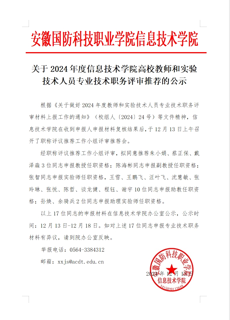 关于2024年度信息技术学院高校教师和实验技术人员专业技术职务评审推荐的公示