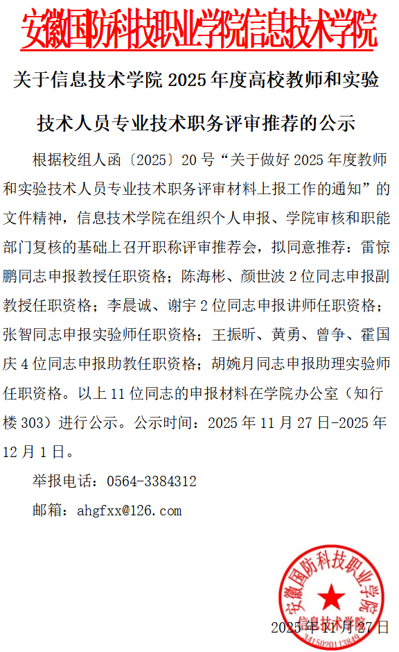 信息技术学院2025年度高校教师和实验技术人员专业技术职务评审推荐公示