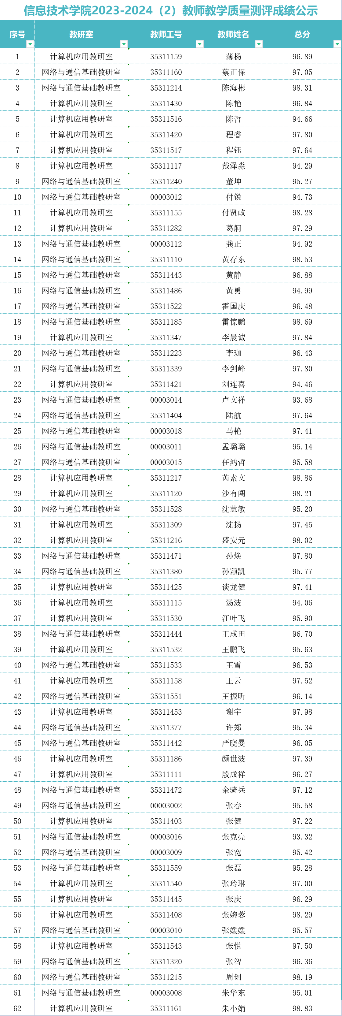 根据《beat365唯一官方网站教师教学质量考核评价办法(修订)》,信息技术学院2023-2024学年第二学期教学质量考评工作已经完成,现将考评成绩公示如下。