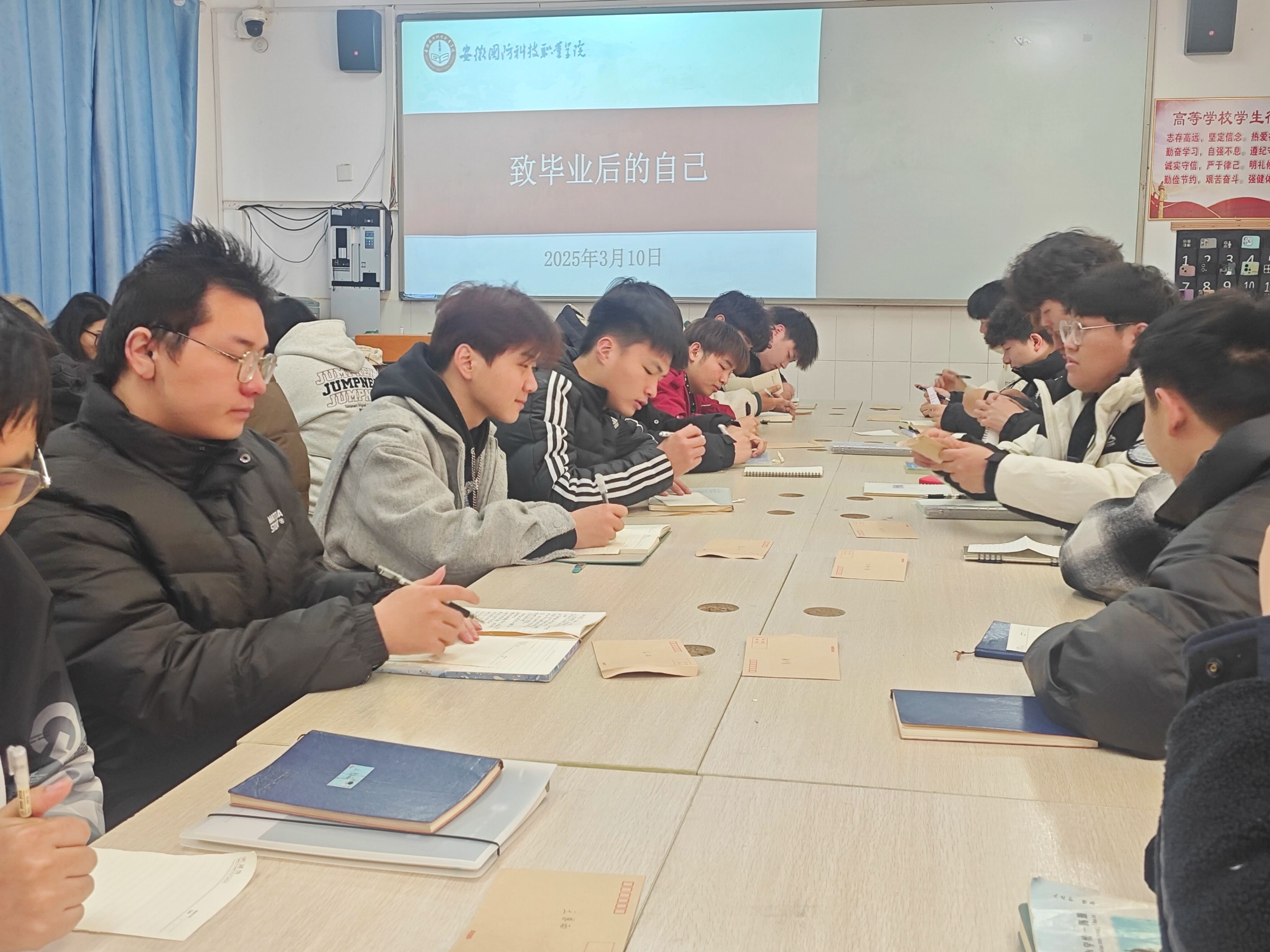 “听听他们怎么说”主题活动,旨在通过聆听往届学生的“心声”,帮助2023级的学生进一步明确目标,奋发进取。整个活动现场气氛热烈,所有人都若有所思,若有所悟。活动最后,张媛媛布置了小作业——致毕业后的自己,并对大家的毕业方向做了调研,调研结果显示同学们的毕业方向主要是实习就业、专升本和参军入伍。