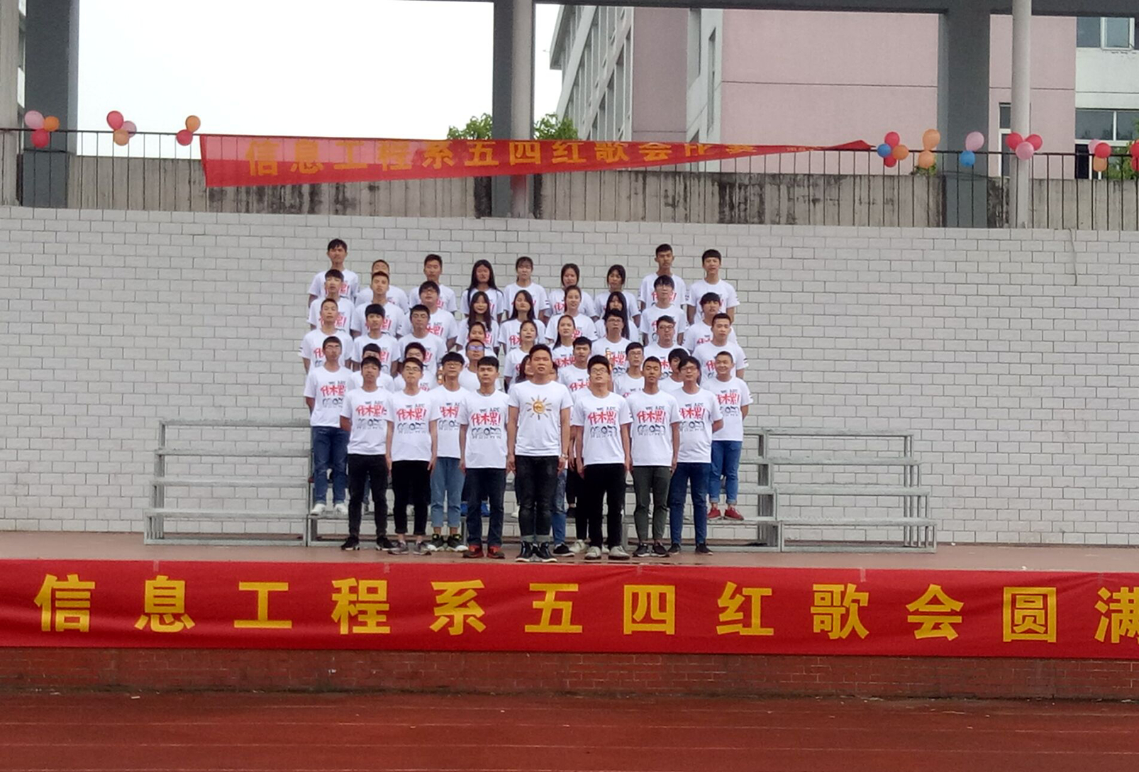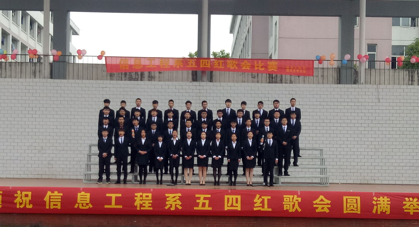 为隆重纪念"五·四"爱国运动,4月26日下午,信息工程系在风雨操场看台举行“五·四”班级大合唱比赛。信息工程系党总书记梁继会、团总支书记杨庆颖、15级辅导员陈晨、16级辅导员赵忠阳和各班班主任出席并担任评委,共同庆祝五四青年节。