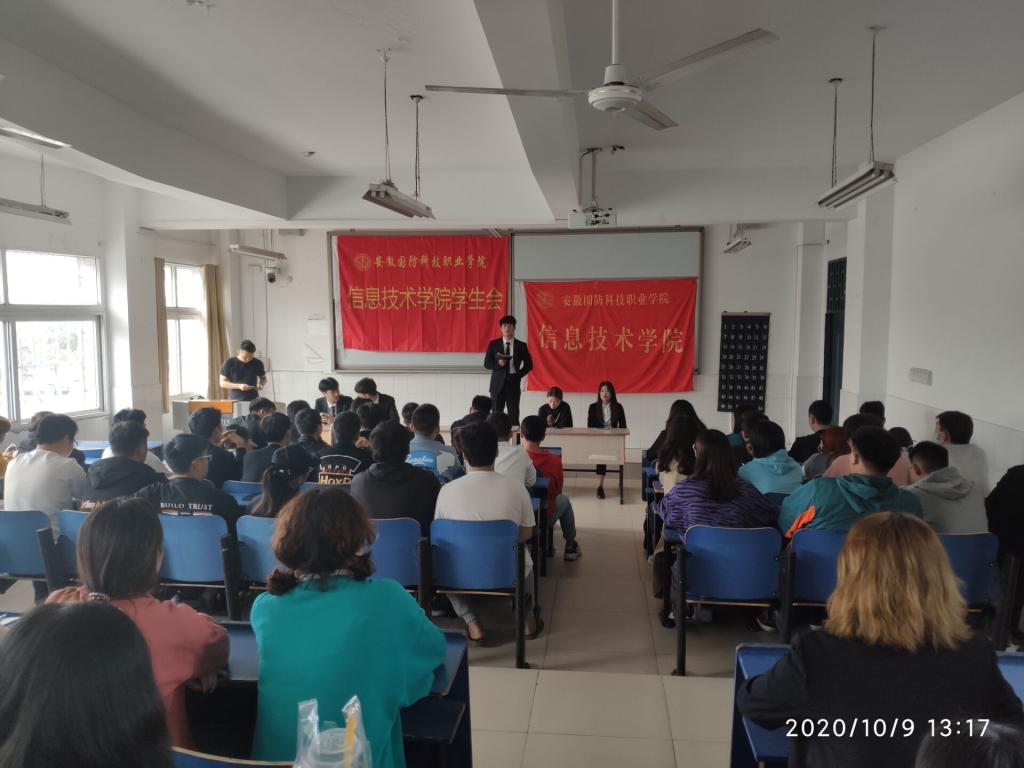 本网讯(信息技术学院 孙颖凯)为深入贯彻落实校迎新工作文件,信息技术学院于10月9日中午召开2020年迎新志愿者工作会议,深入学习领会迎新文件精神,进一步进行迎新工作部署。信息技术学院老师孙颖凯、团总支学生会全体成员、19级各班级主要班委以及挂靠社团主要干部参会。会议由信息技术学院团总支学生会主席王旭主持,信息技术学院老师孙颖凯发言。