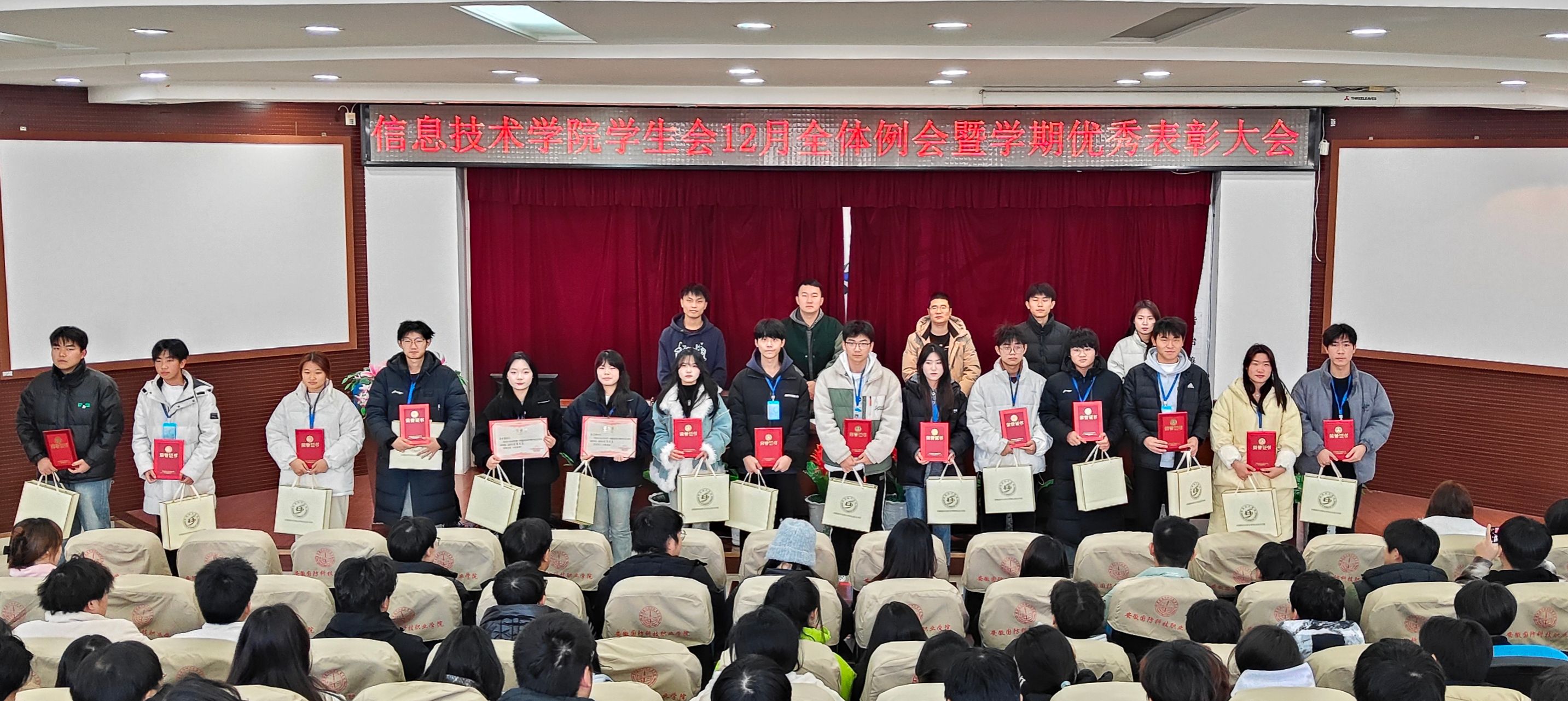 本网讯(信息技术学院 孙颖凯)为了总结信息技术学院学生会本学期各项工作经验,凝聚团队力量,激励广大成员奋勇争先,也为学院学生工作的持续推进与创新发展锚定方向。信息技术学院于12月20日中午在图书馆报告厅开展了学院学生会12月全体例会暨学期表彰大会。学院党总支副书记杜洪宇、团总支孙颖凯出席了会议,会议由学院学生会主席团解雯欣主持,全体学生会成员参加了会议。