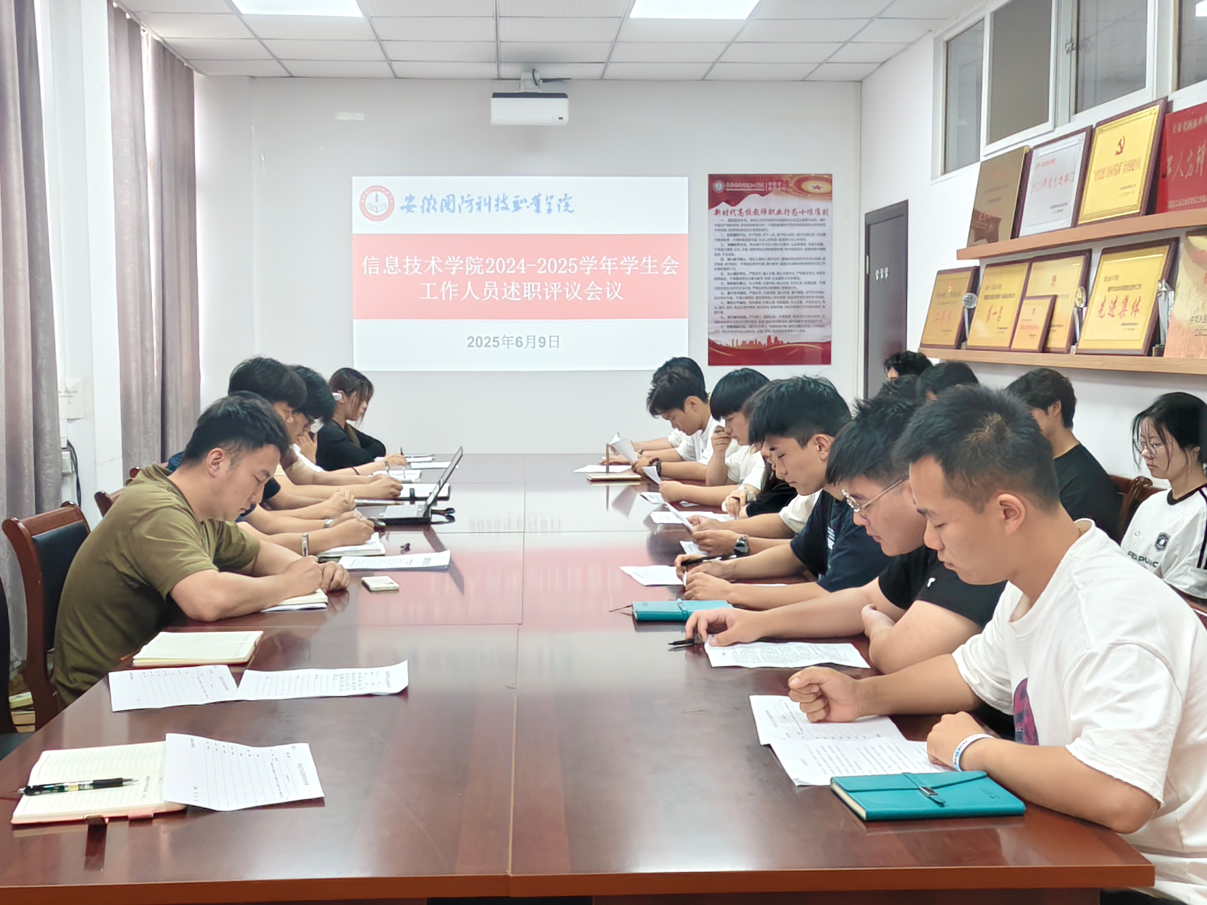 本网讯(信息技术学院 孙颖凯)为全面总结学生会工作成效,强化学生干部责任意识与服务意识,6月9日,信息技术学院在知行楼304会议室召开2024-2025学年学生会工作人员述职评议会议。学院党总支副书记杜洪宇、团总支负责人孙颖凯、学生会全体学生干部及学生代表参与会议,共同回顾过去一学期学生会的工作成果,并为未来发展建言献策。会议由孙颖凯主持。