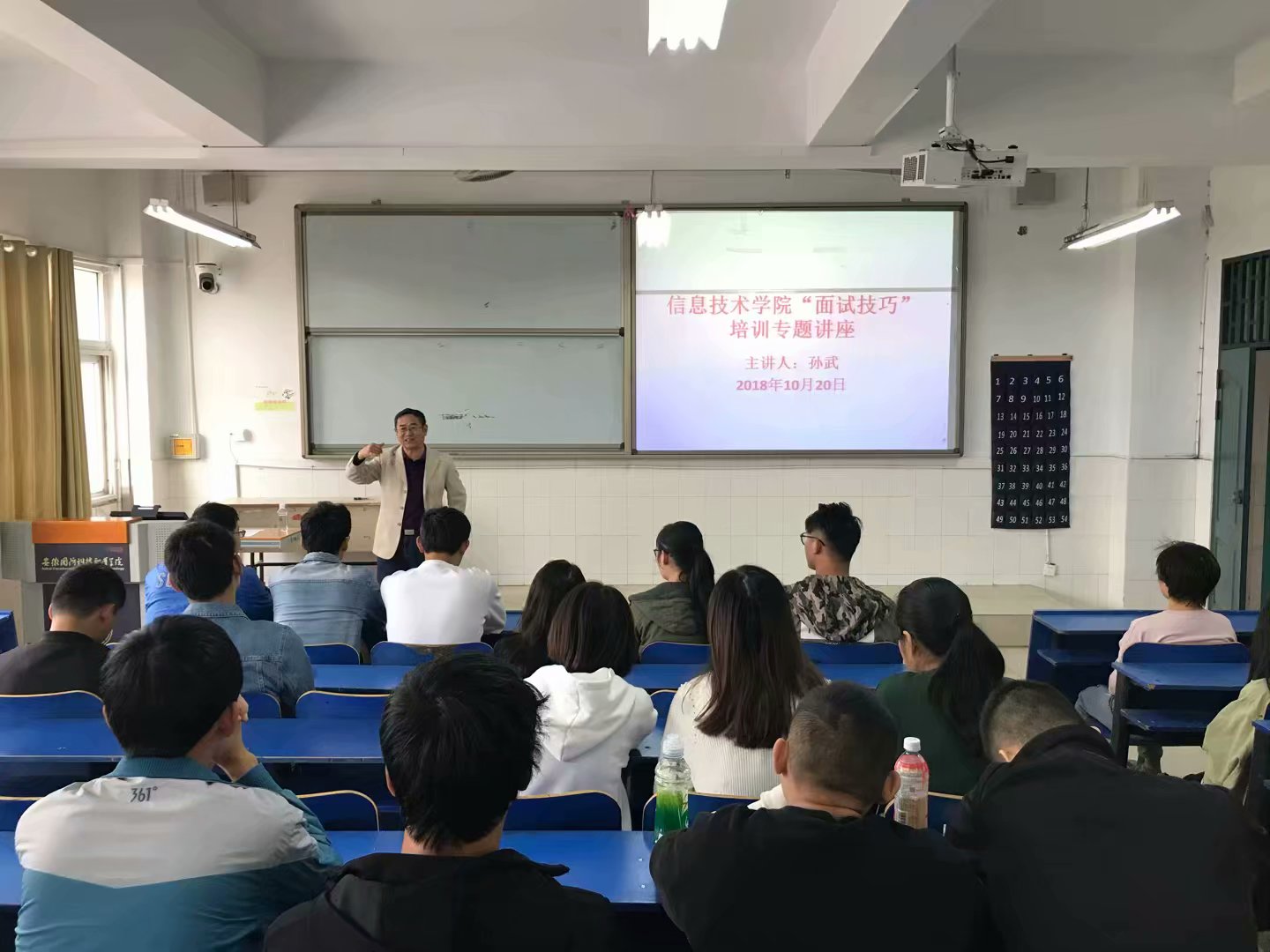 16级学生顶岗实习在即,为了帮助同学们树立正确的就业、择业和创业观,在求职面试时达到事半功倍的效果,增强就业竞争力,10月20日上午9点,信息技术学院在教二楼205教室组织开展了16级学生“面试技巧” 培训专题讲座,院党总支书记孙武主讲。