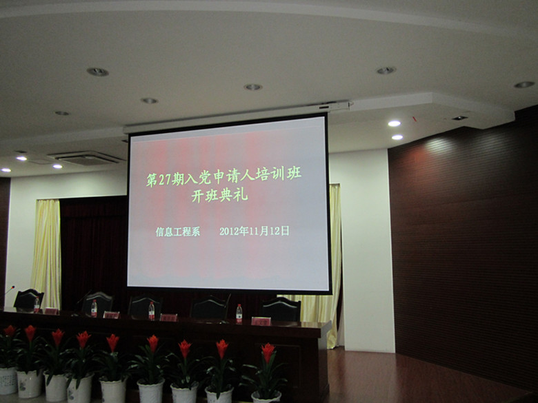 11月12日晚,信息工程系第27期入党申请人培训班开班典礼在图书馆报告厅隆重举行,大会由系学生支部组织委员陈晨主持,系党总支书记梁继会、系主任黄存东、系办主任王文堂、系团总支书记张伟业出席了典礼。