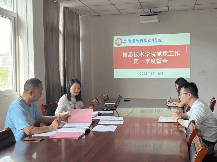 2023年5月19日下午,信息技术学院在知行楼304会议室开展第一季度党建督察工作。学院党总支副书记杨庆颖、组织员吴伟和支部代表通过现场翻阅组织活动记录本、查阅新闻记录等,检查各支部第一季度党建工作开展情况。