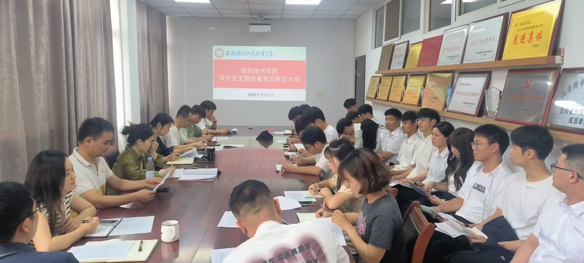 本网讯(信息技术学院 薛蕊)信息技术学院学生党支部于2023年7月1日在知行楼304会议室召开预备党员转正大会,会议由学生党支部书记杨庆颖主持,支部全体党员参加,主要讨论王鑫等15名预备党员能否按期转为中共正式党员问题。