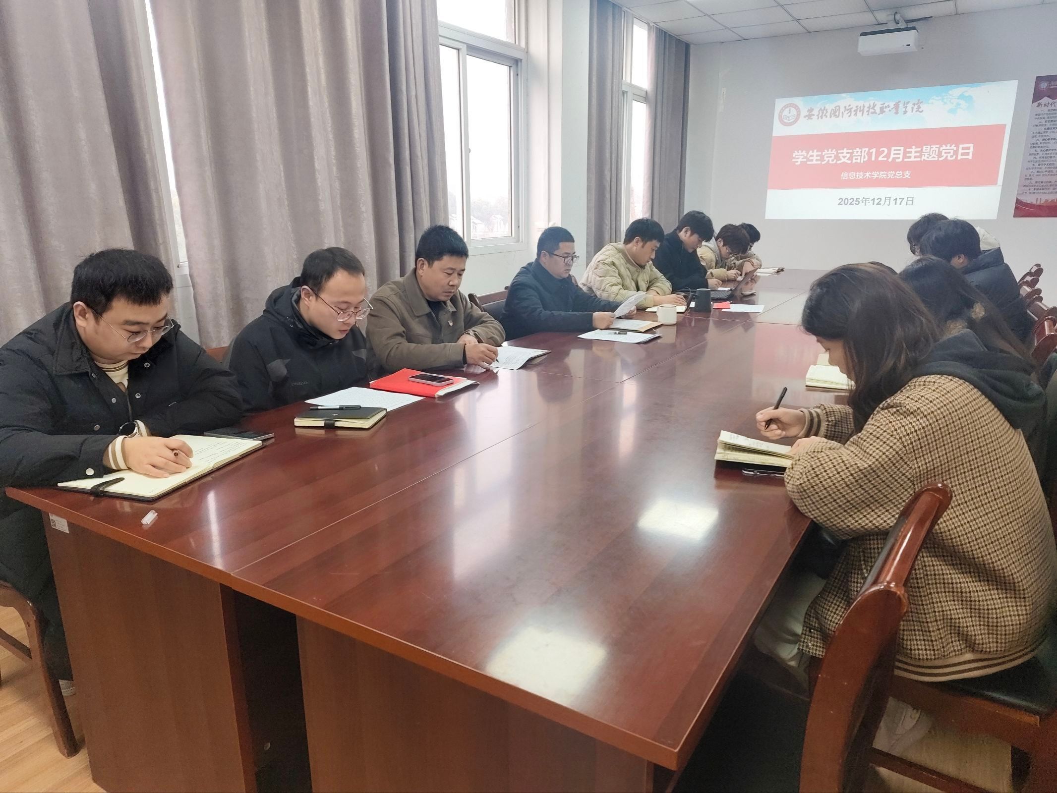 本网讯(学生通讯员 马燕妮)12月17日,信息技术学院学生党支部在知行楼304会议室召开12月份党员大会。会议由支部书记杜洪宇主持,全体在校师生党员参会,校外实习党员线上同步参会。