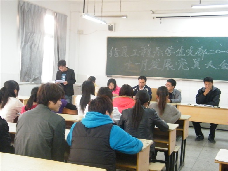 年11月10日,我系学生党支部在2#102召开发展党员大会。此次大会由学生党支部书记王文堂主持,严格履行程序,经过到会党员充分讨论后,本期共有19名学生被吸收为中共预备党员,使我系党员队伍得到进一步壮大,战斗力得以进一步加强。会议最后,系党总支书记梁继会作了总结性的发言,对19位预备党员表示祝贺,并提出了希望,期望19位新同志能更加努力学习和工作,树立党员模范形象,秉承党员精神,全心全意为人民服务。