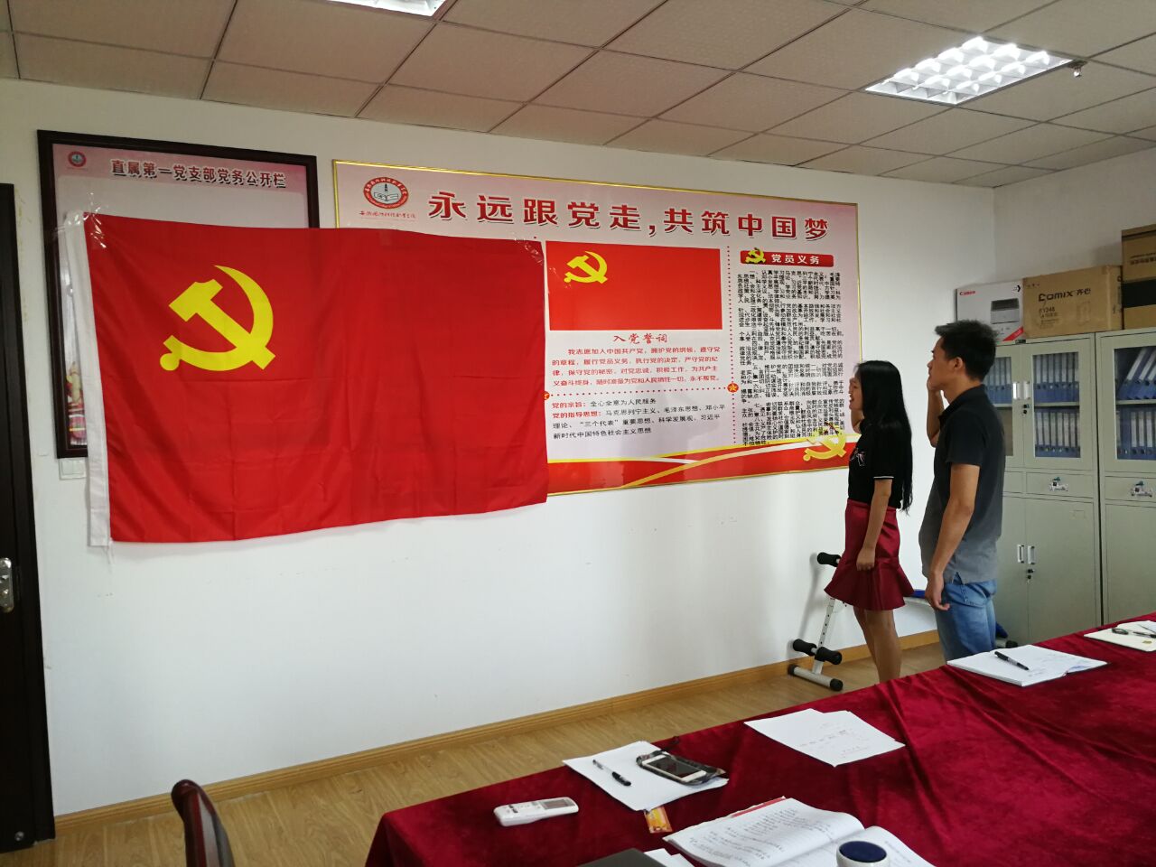 在雄壮的《国歌》声中,宣誓仪式落下帷幕。支部全体党员和两名入党积极分子参加了活动。