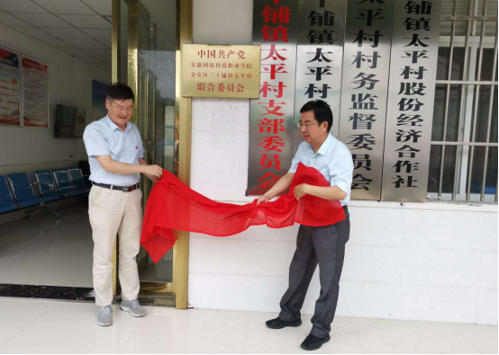 本网讯(学校驻村扶贫工作队 袁帅)为进一步巩固结对帮扶成果,谋划太平村乡村振兴新篇章,近日,经六安市直工委批准,中共beat365唯一官方网站金安区三十铺镇太平村联合委员会正式成立。7月14日,学校党委书记余嗣元赴学校帮扶村——六安市金安区三十铺镇太平村为联合党委揭牌,校党委委员、党政办主任李存鹏,党委委员、组织人事处处长付贤政陪同。三十铺镇党委书记项阳、党委副书记崔伟、太平村村两委、驻村扶贫工作队、党员等30余人参加了揭牌仪式,仪式由太平村书记宋杰主持。
