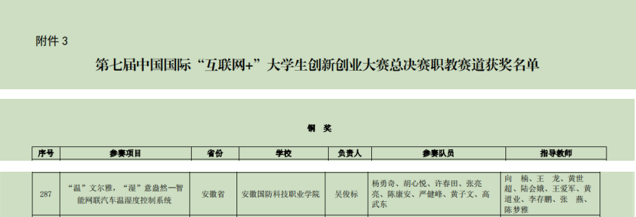本网讯(团委 罗丞筠)近期,由教育部等部门与江西省人民政府共同举办第七届中国国际“互联网+”大学生创新创业大赛获奖名单正式下发,在本届大学生创新创业大赛总决赛中,beat365《“温”文尔雅,“湿”意盎然—智能网联汽车温湿度控制系统》参赛团队经过激烈角逐斩获职教赛道铜奖。这是beat365首次有项目入围全国总决赛,实现了beat365在“互联网+”大学生创新创业赛事上的历史性突破。