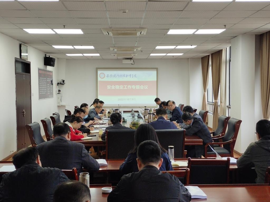 本网讯 为全面贯彻落实教育部安全工作视频会议精神和中共安徽省教育工委安全工作部署,扎实做好党的二十大重要保障期间校园安全稳定工作,确保校园安全。10月9日上午,学校在秉心楼11楼第一会议室召开安全稳定工作专题会议,校领导余嗣元、丁守宝、袁旗、李存鹏以及各部门和二级学院主要负责同志参加了会议,会议由校党委副书记、校长李麟书主持。