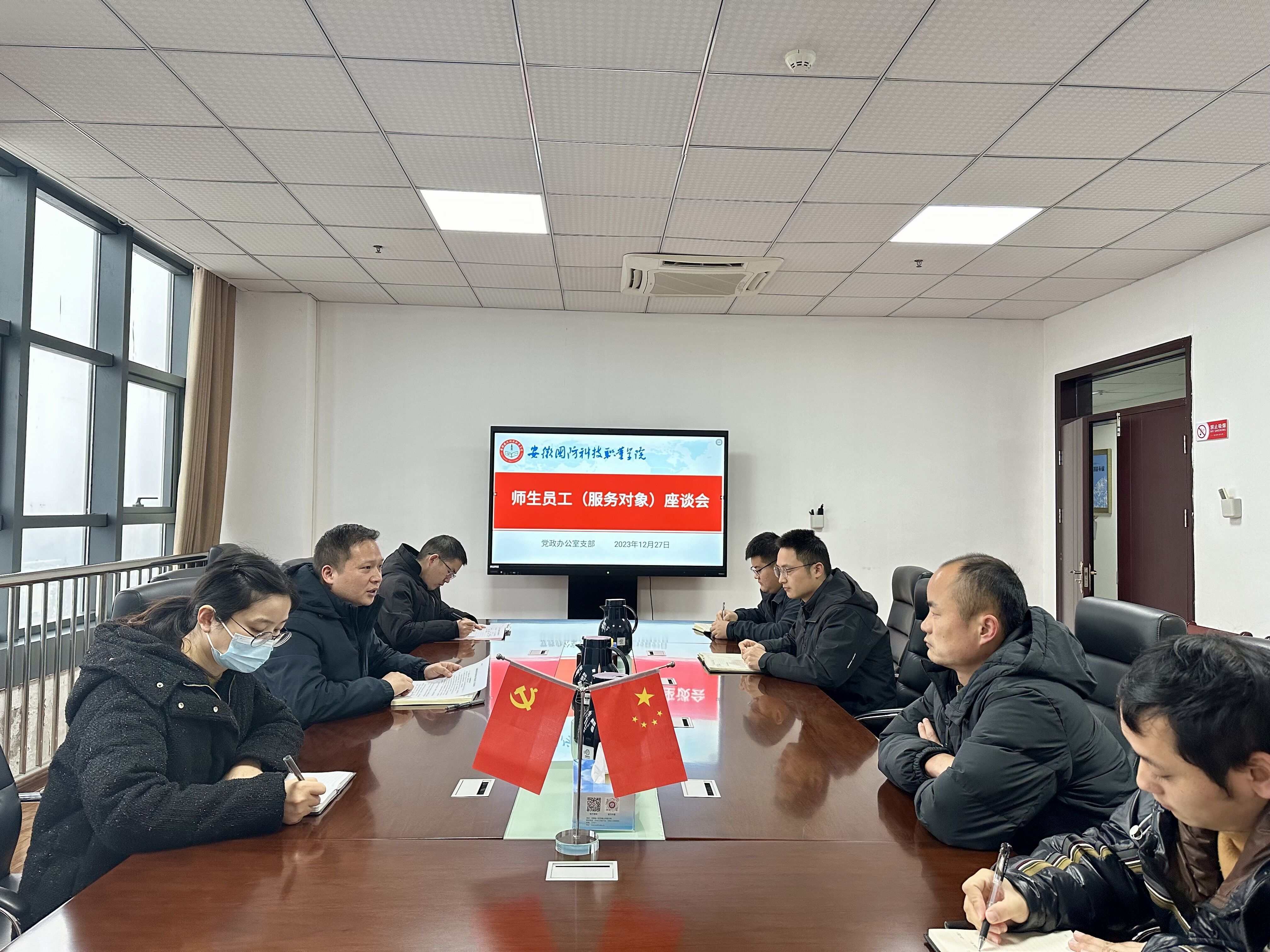 为进一步提升工作质效,提升为师生服务的水平和能力,了解师生员工对党政办服务工作等方面的意见,党政办党支部于2023年12月27日上午9点在秉心楼1106党委会议室召开师生员工(服务对象)座谈会,职能部门代表、二级学院师生代表参加座谈会,会议由党政办公室副主任侯超众主持。