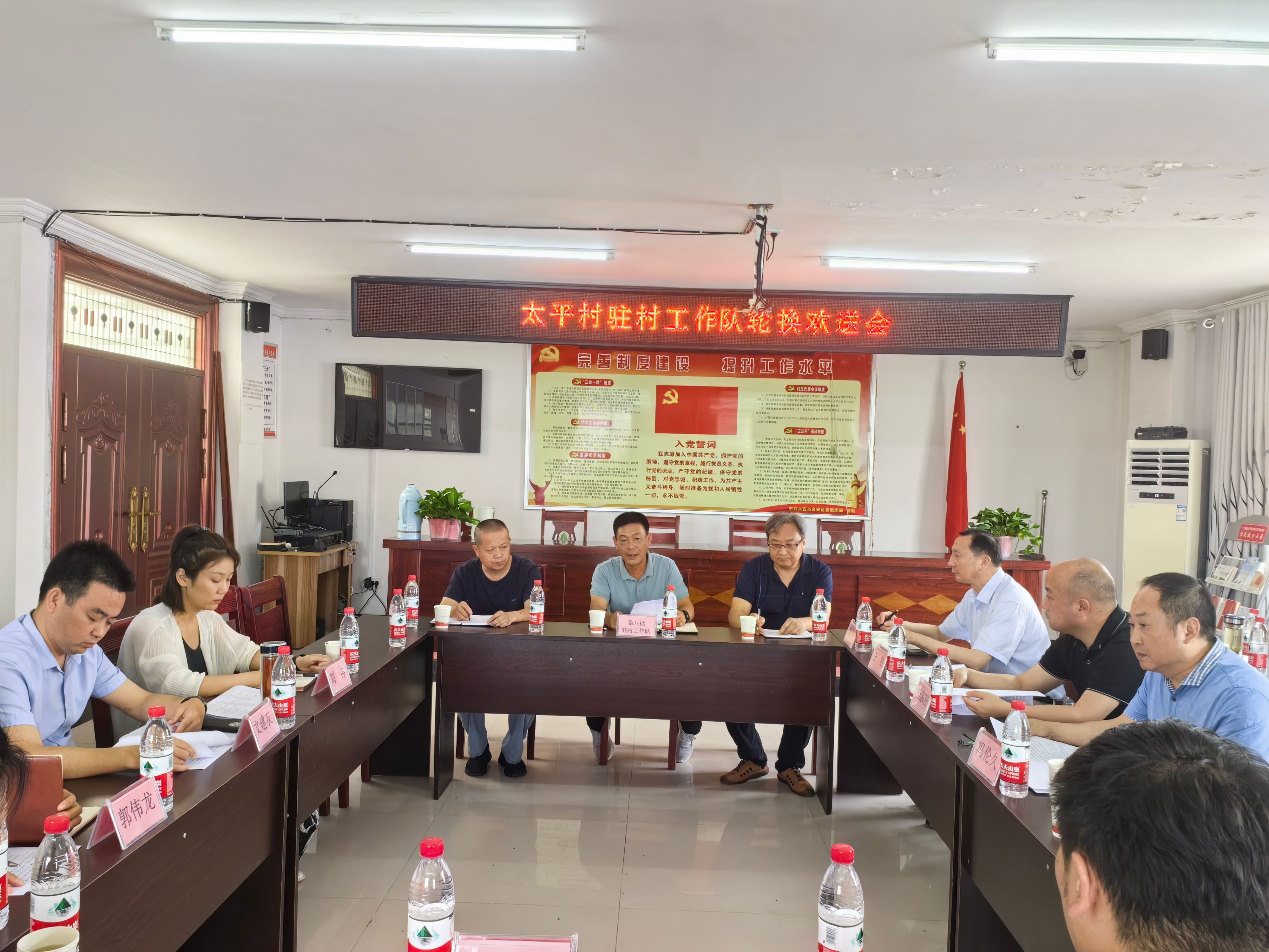 会上,第八批驻村第一书记韩纪平代表驻村工作队报告了乡村振兴结对帮扶三年来的工作情况,分享了工作经验和做法,对第九批驻村干部提出希望和工作建议。金安区统计局、金安区妇幼保健院、三十铺镇、太平村等单位与会领导充分肯定了第八批驻村工作队三年来取得的成绩,对驻村帮扶干部的辛勤付出表示感谢。第九批新任驻村第一书记韦志魁及工作队员作了表态发言。