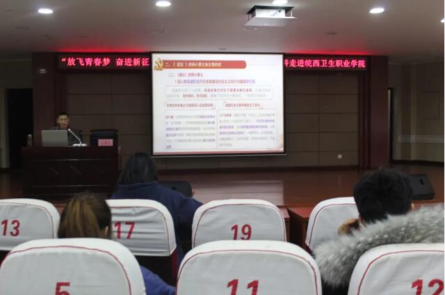 (供稿:皖西卫生职业学院团委副书记 鲁迪)1月13日晚,皖西卫生职业学院在科技报告厅一楼举行“放飞青春梦,奋进新征程”十九届五中全会精神宣讲走进皖西卫生职业学院报告会,由六安市青年宣讲团成员、安徽国防科技职业学院教师发展中心办公室主任、汽车技术学院团总支书记杨志清老师作宣讲,皖西卫生学院团委副书记鲁迪主持。
