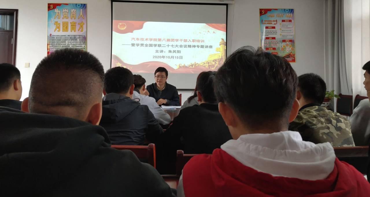 为深入学习贯彻全国学联二十七大和习近平总书记的贺信精神,落实上级关于从严治团的工作要求,10月15日中午,汽车技术学院在知行楼416会议室举办新入职学生干部专题培训。汽车技术学院团总支负责人朱其阳担任主讲,全体学生干部按时参加培训,培训会由院学生会主席李栋主持。