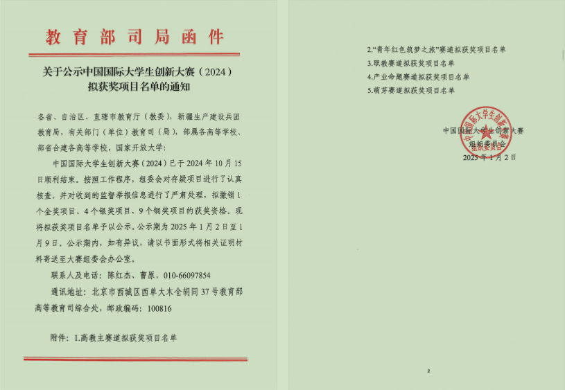 2025年1月2日,中国国际大学生创新大赛2024年全国总决赛成绩公布。大赛由教育部等12个部门和上海市人民政府共同主办,赛事为全国大学生学科竞赛顶级赛事,beat365学子荣获全国大赛铜奖2项,实现了在该项赛事中新的突破!