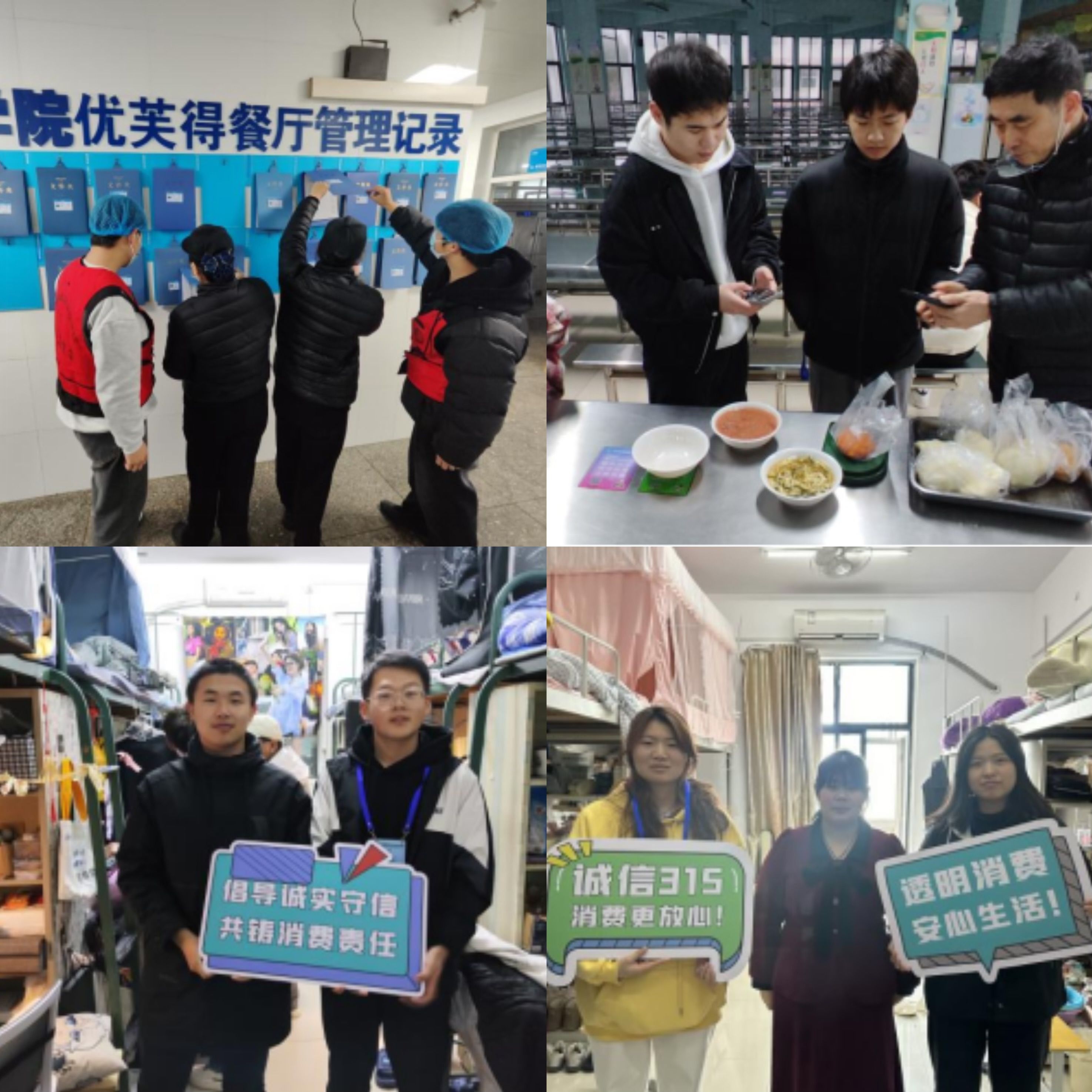 权益“青”风,校园同行 3月16日——3月18日校学生会招募学生志愿者深入食堂后厨,仔细查看食材质量、卫生状况及操作流程。通过此次活动,学生们进一步增强了对食品卫生的认识和责任感。同时校学生会权益部深入学生宿舍,宣传食品安全知识,发放《食品安全指南》、《315科普宣传单》等提醒同学们注意饮食健康,识别优劣食材,提升自我保护能力。