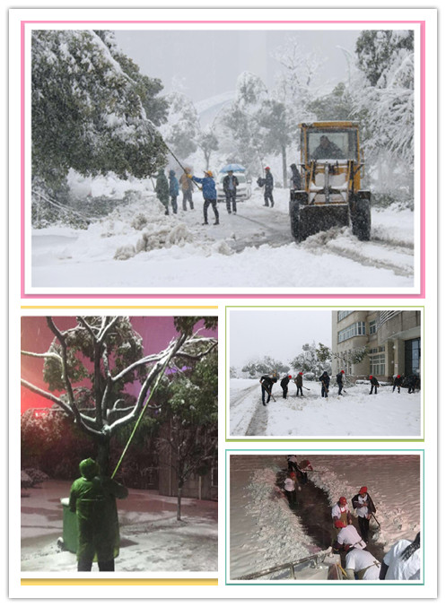 从3日夜里开始,学校相关部门就积极组织后勤和物业对校园绿化苗木进行除雪,同时清扫人行通道。