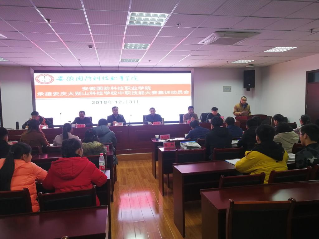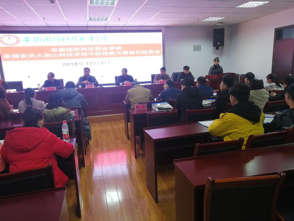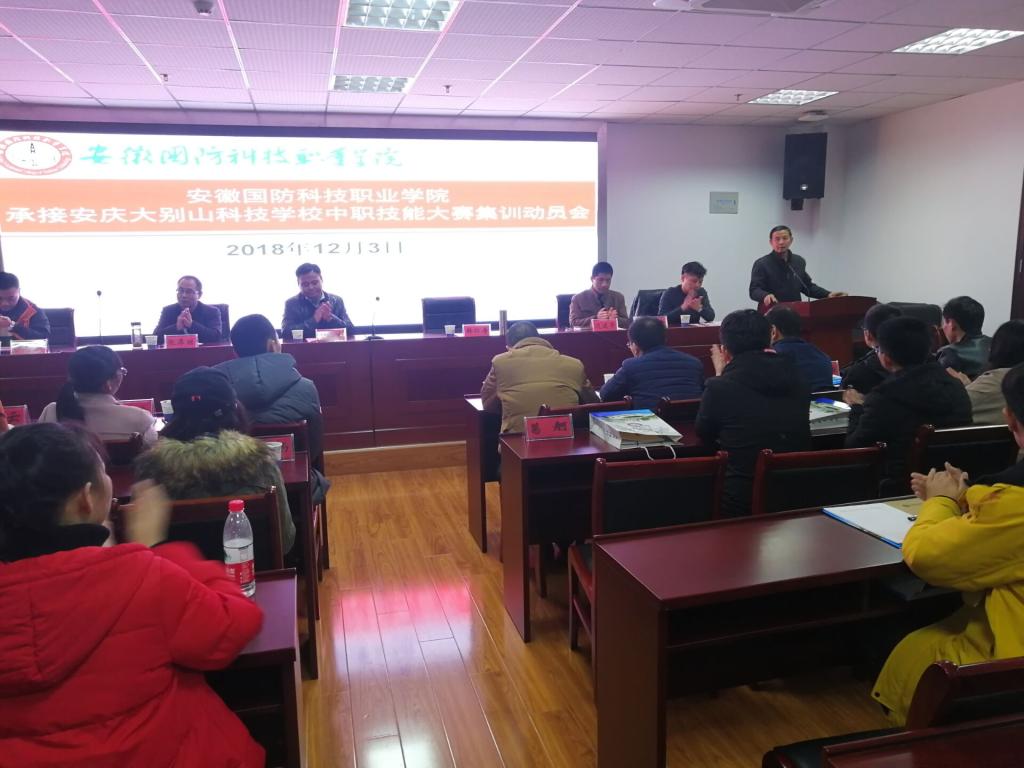 为贯彻落实安徽国防科技职业教育集团2018年度会议精神,做好安庆大别山科技学校中职技能大赛集训的承接工作,力争使安庆大别山科技学校在2018年中职技能大赛中取得优异成绩,12月3日下午,学校在综合楼12楼会议室召开了beat365唯一官方网站承接安庆大别山科技学校中职技能大赛集训动员会。
