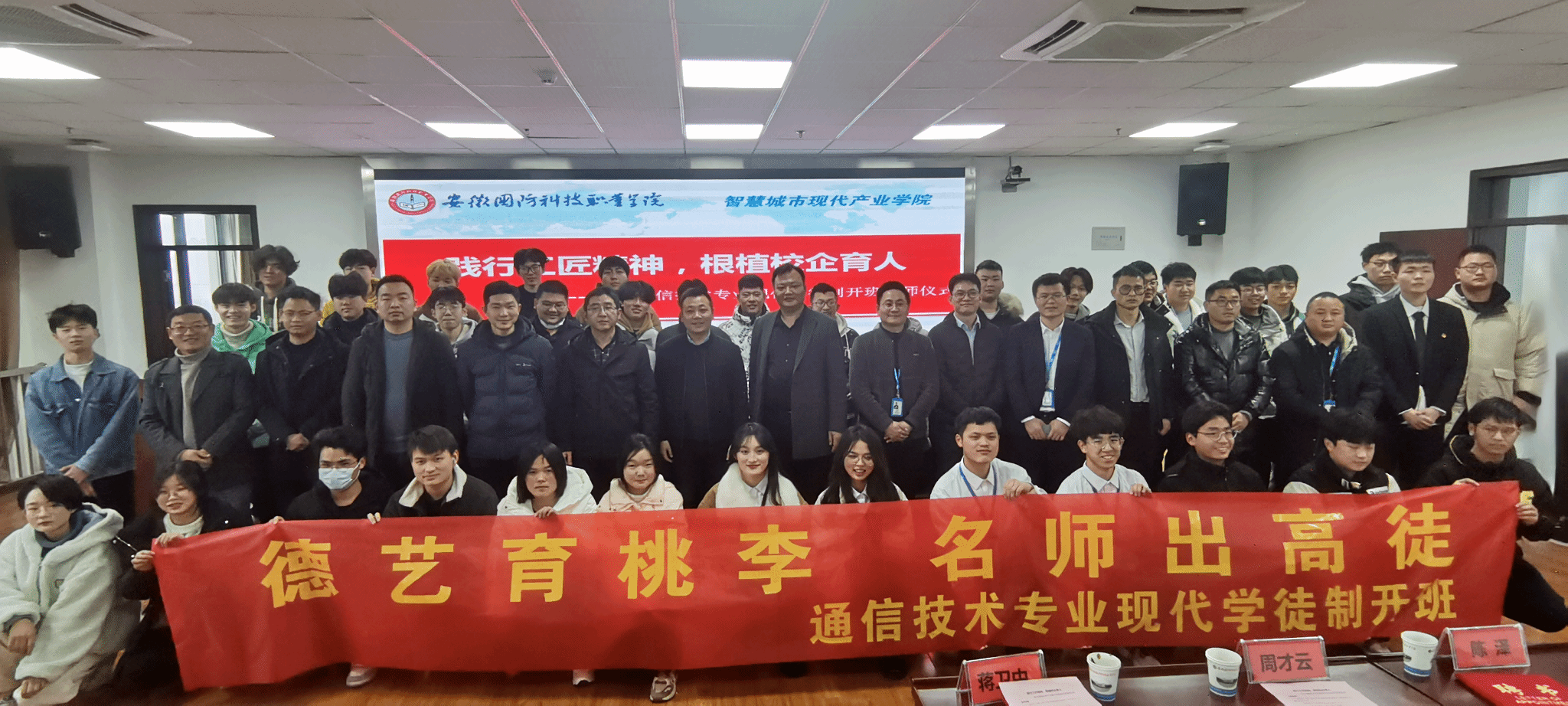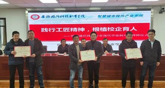 本网讯(信息技术学院 王干) 德艺育桃李,名师出高徒。为进一步深化产教融合,优化人才培养模式,推动“双高”专业群建设,2月22日下午,信息技术学院——智慧城市产业学院现代通信技术专业“现代学徒制开班暨双导师制拜师仪式”在秉心楼12楼隆重举行。校党委委员、信息技术学院院长沙有闯、教育谷投资控股有限公司、中鸣瑞创教育科技有限公司副总经理李保桥,中兴通讯(南京)有限责任公司、南京顺盛通信科技有限责任公司合肥分公司、浙江省邮电工程建设有限公司安徽分公司的领导与师傅代表,校内专业导师蔡正保、王干、任鸿哲以及2022级现代通信技术专业的140余名学子出席本次仪式。仪式由信息技术学院副院长雷惊鹏主持。