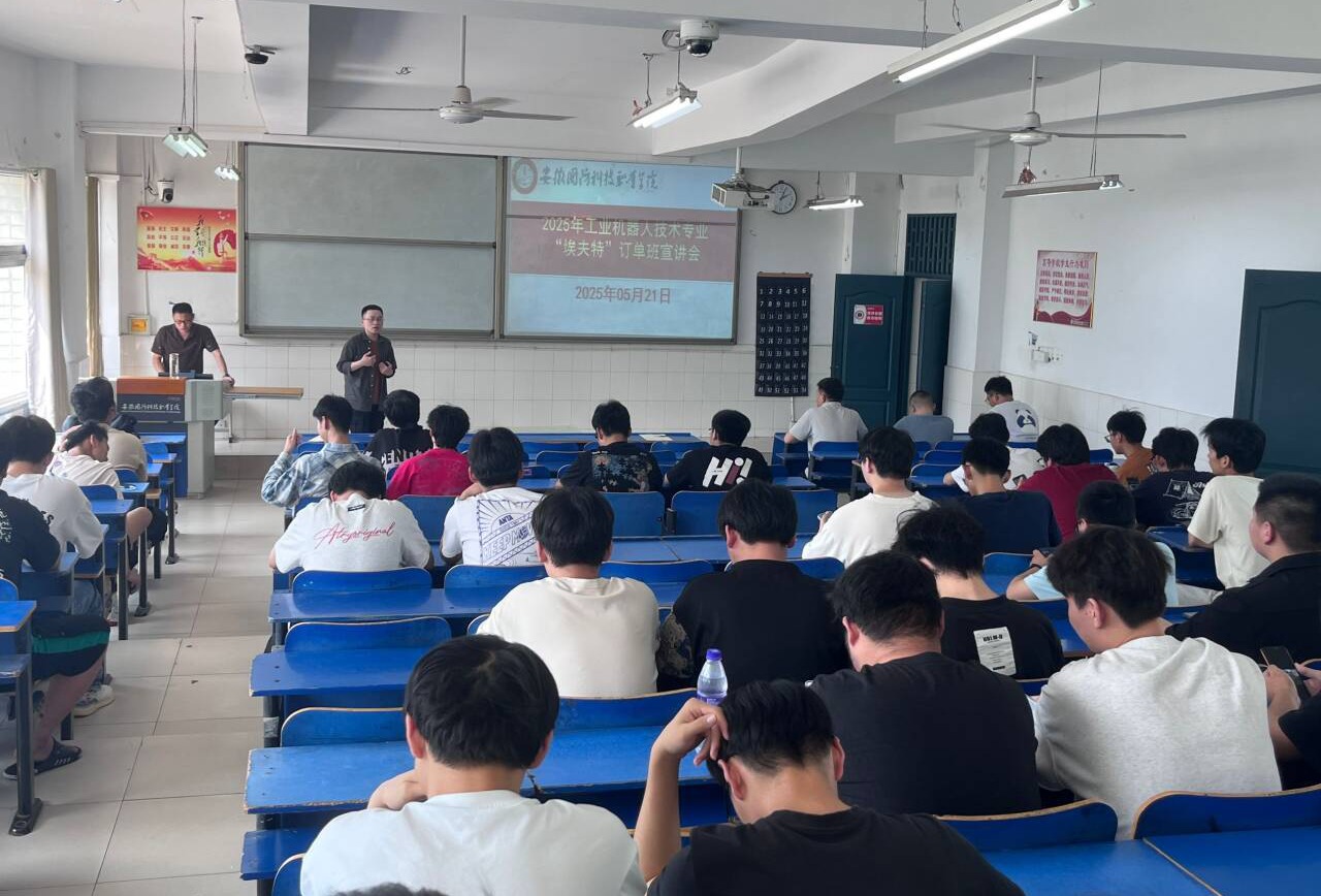 本网讯(电气技术学院 吴年祥)为深化教育教学改革,全面提高人才培养质量,促进校企深度融合,5月21日下午14点,beat365唯一官方网站电气技术学院“埃夫特”订单班宣讲会及签约仪式隆重举行。此次会议由安徽省技能大师工作室领办人吴年祥主持,工业机器人技术专业骨干老师严正红、金玉好、何睿以及23、24级机器人班级110余位同学齐聚一堂,共同见证这一重要时刻。