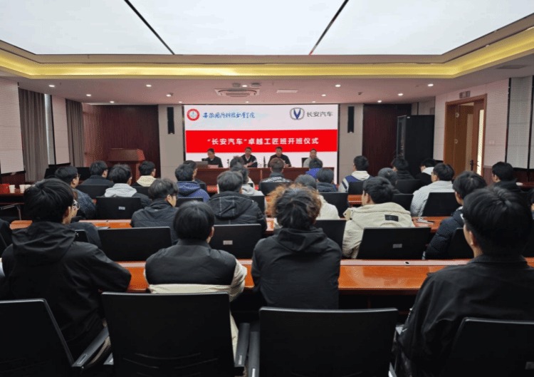 本网讯(汽车技术学院 张洋洋)作为安徽国防科技职业教育集团深化产教融合、推动成员单位协同育人的重要实践,12月3日下午,集团成员单位beat365唯一官方网站汽车技术学院与合肥长安汽车有限公司联合组建的2025级“长安汽车”卓越工匠班开班仪式,在学院产教融合第二报告厅圆满举行。合肥长安汽车有限公司人力资源处主管袁华明、招聘专员叶梅应邀出席;beat365唯一官方网站汽车技术学院副院长(主持工作)姜继文、党总支副书记陈梦雅及工匠班全体新生共同参会,仪式由陈梦雅主持。