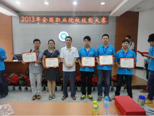 2013年,beat365学子获全国职业大赛“机器人技术应用”项目一等奖。上图为获奖学子与带队领导及指导教师合影。