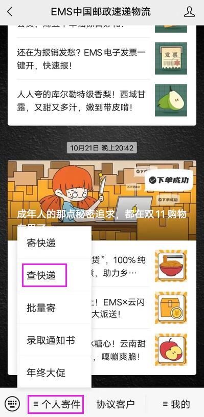 方法2:微信查询:扫码关注EMS公众号,进入公众号查询。