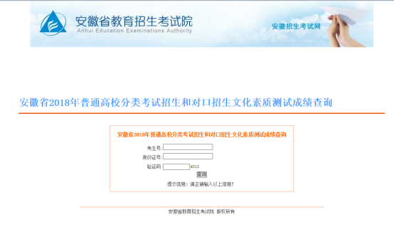 根据招生计划、报名人数和考试成绩等因素综合测算,报省教育厅批准,安徽省2018年普通高校分类考试招生文化素质测试合格分数线为100分,退役士兵填报单列计划文化素质测试合格分数线为60分。考生可登陆安徽招生考试网http://cx.ahzsks.cn/或用手机扫描该网站右上角二维码关注省考试院微信公众号查询自己的考试成绩。应用型本科面向中职毕业生对口招生文化素质测试成绩可同时通过上述途径查询。