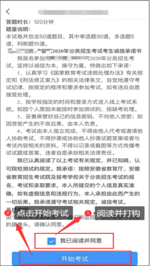 2.点击考试按钮,阅读并同意考生承诺后进行打钩,点击“开始考试”;
