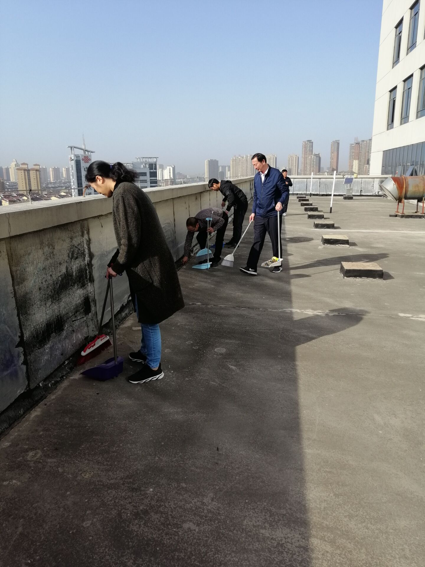 学院秉心楼十楼楼顶平台,常年残留部分建筑遗留垃圾,大量落叶、烟头及排水沟污泥等,支部党员带着卫生工具,有的清扫、有的手捡、有的搬运,很快楼面整洁干净、焕然一新。