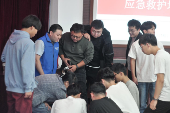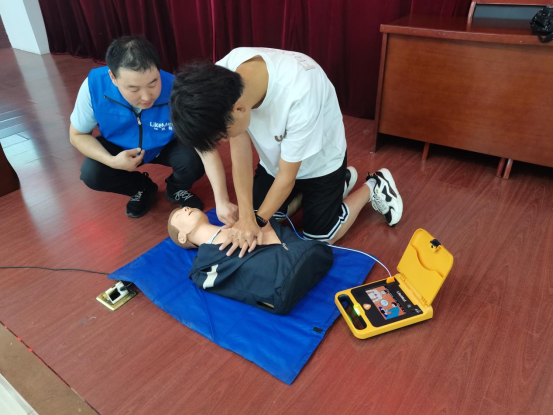 参训师生认真听讲,反应非常热烈,实操演示时气氛尤为活跃,积极上前对“模拟人”进行急救操作,练习使用自动体外除颤仪(AED),在沈老师的指导下,参训人员短时间内掌握了心肺复苏的基本手法和要点,自动体外除颤仪(AED)的使用步骤和注意事项。