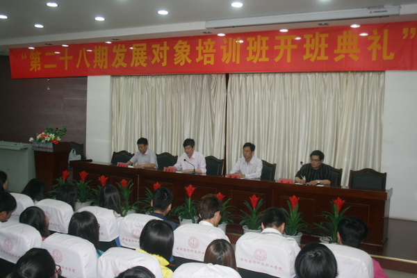 5月14日下午,我院第二十八期发展对象班开班典礼在报告厅隆重举行。院党委书记、党校校长余嗣元,党政办主任兼宣传部部长、党校教务长袁旗,纪检监察室副主任、党校培训班辅导员黄波,各系从事党员培养、发展工作的相关同志及220名学员代表参加了开班典礼。典礼由组织人事处处长张宗江主持。开班典礼在庄严的国歌声中拉开帷幕。