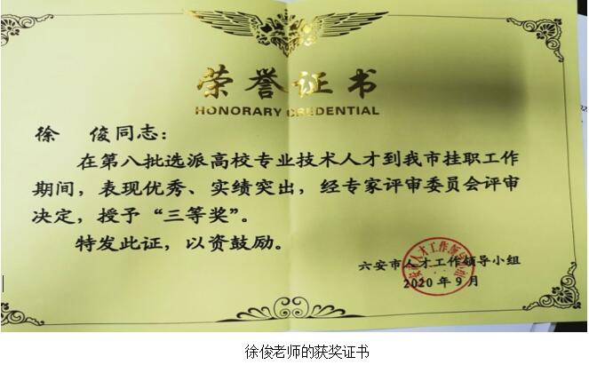 近日,安徽省优秀高校(科研院所)挂职专业技术人才评选表彰工作会议在六安索伊君澜酒店召开,beat365机械技术学院张爽华、陈云、徐俊三位教师在挂职期间表现优秀,工作出色,成绩突出,荣获六安市人才工作领导小组颁发的第八批优秀高校挂职专业技术人才三等奖荣誉证书。本届优秀高校挂职专业技术人才奖共评出一等奖3名,二等奖6名,三等奖10名。